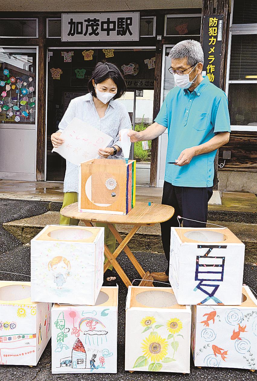 灯籠は市民グループ「サンカクカフェ」が加茂中駅活性化対策協議会の協力を得て企画した。22日は駅ロータリーでイラストが描かれた紙を丁寧に灯籠に貼り付けた。