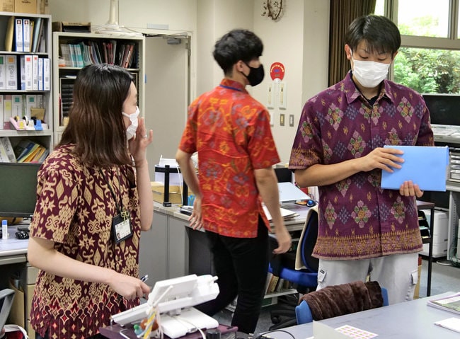 バティックはろうけつ染め、イカットはかすり織りの布地。着用は交流を盛り上げようと、2019年度から続ける。7~10月の毎週金曜日を推奨日としている。