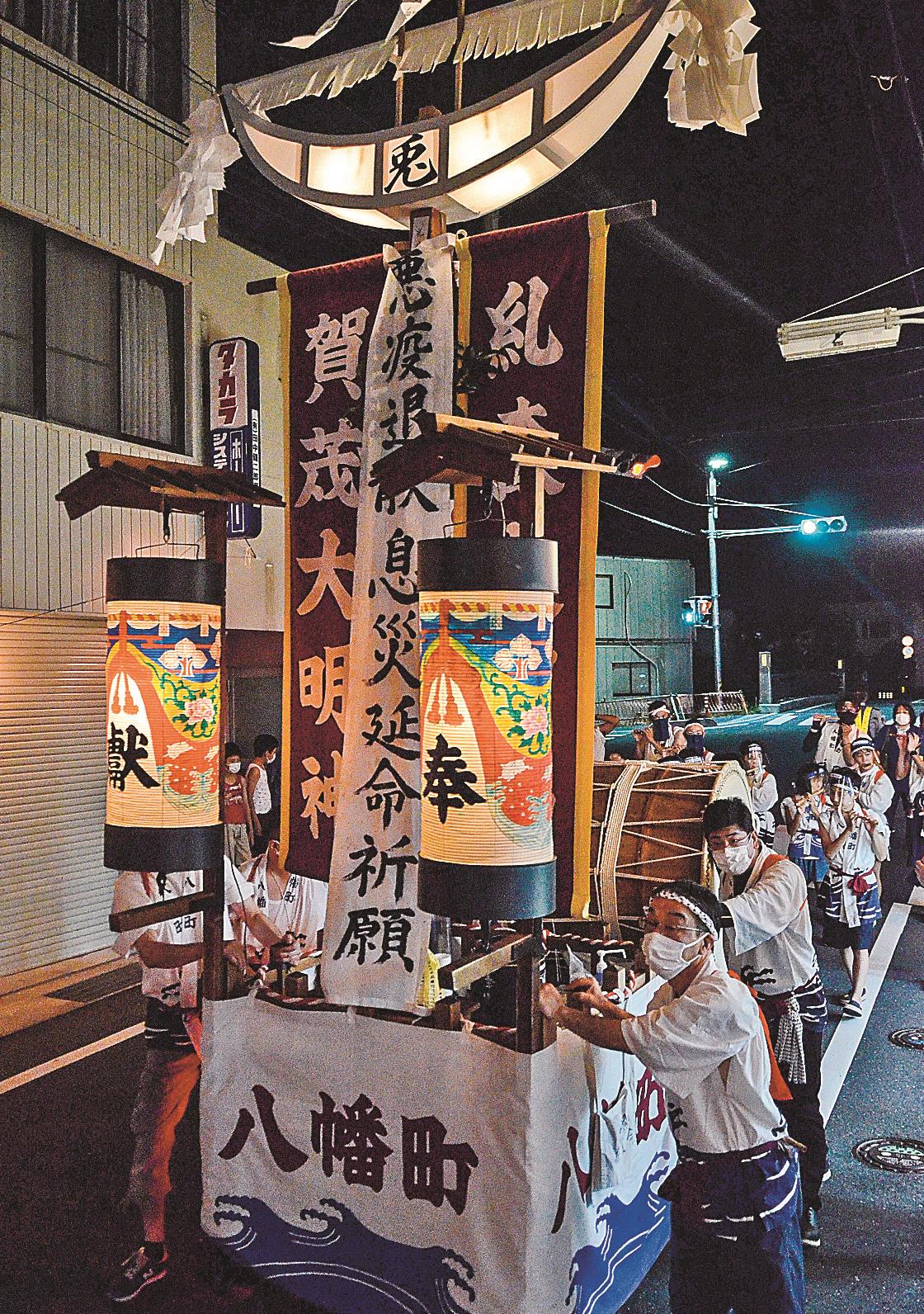 【安来】安来市の夏を彩る「やすぎ月の輪まつり」が14日夜、中心市街地で開かれた。出雲国風土記のサメ退治伝承にちなむ「月の輪神事」があり、サメに見立てた三日月形の灯籠や矛で飾られた山車が練り歩いた。17日まで毎晩行われる。