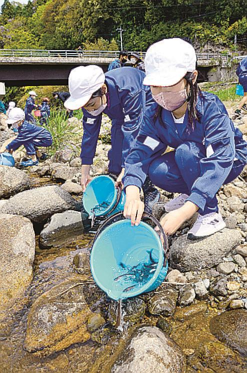 【雲南】雲南市立鍋山小学校(雲南市三刀屋町乙加宮)の全校児童が27日、近くの三刀屋川にアユの稚魚2千匹を放流した。川辺での活動を通じ、ふるさとの川を守っていくことを学んだ。