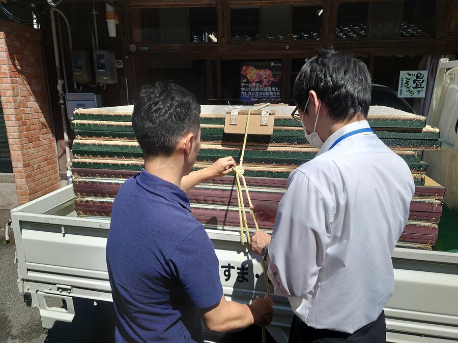動画は畳を受注生産する創業75年の竹内畳店(松江市石橋町)が2021年4月に投稿した。従業員らしき男性が軽トラの荷台に畳を積み込む際、畳をロープで固定する様子が映され、テロップでは「畳積みのプロ」「結び方にコツがある」と説明がある。荷崩れしないよう、固結びをしている模様だ。