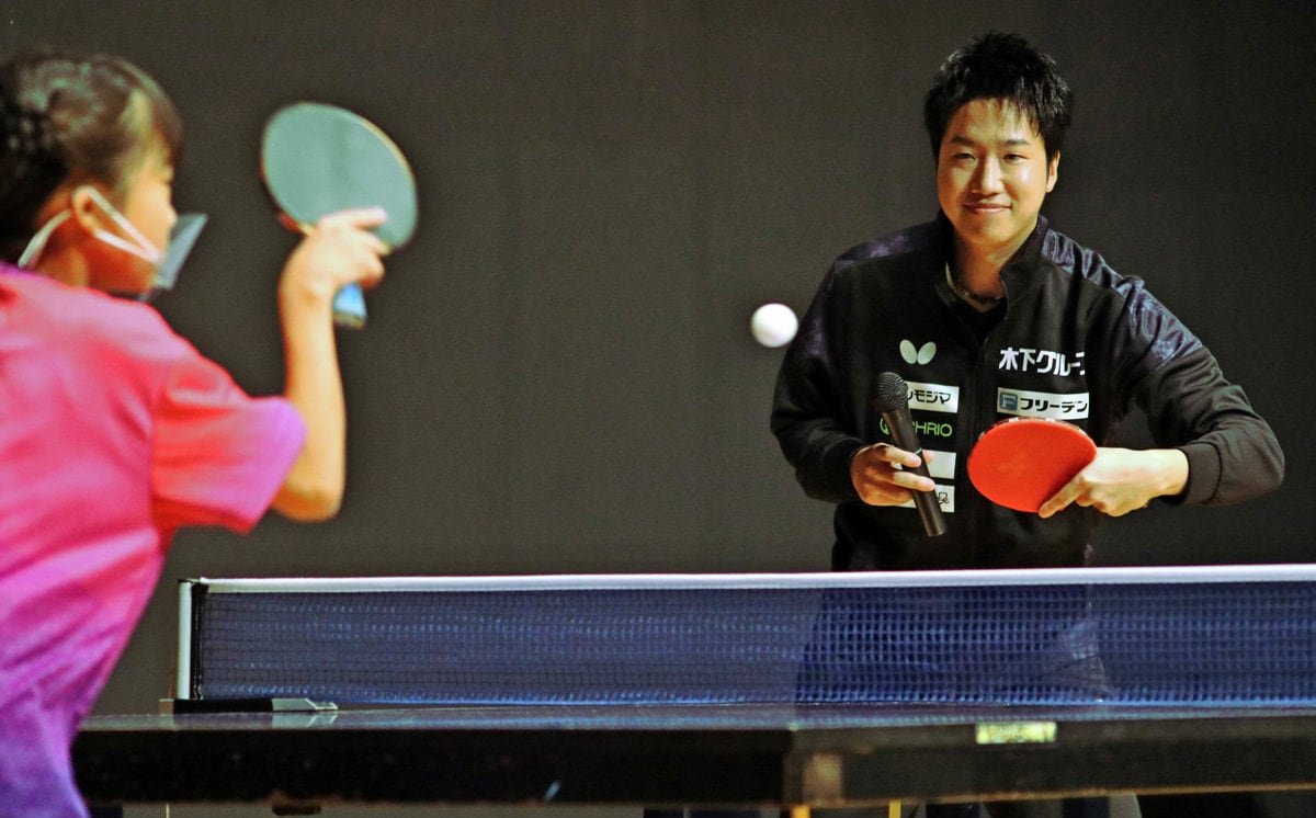水谷さんモデルのラケットで憧れの選手と対戦した杉谷桜太朗くん(11)=松江市立乃木小6年=は「金メダルを取った選手はすごかった。将来は五輪でメダルを取りたい」と話した。