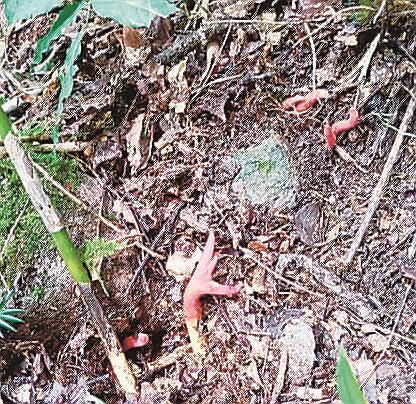 カエンタケは赤だいだい色で人の手の指のような形をしており、誤って食べると死に至る場合もある。