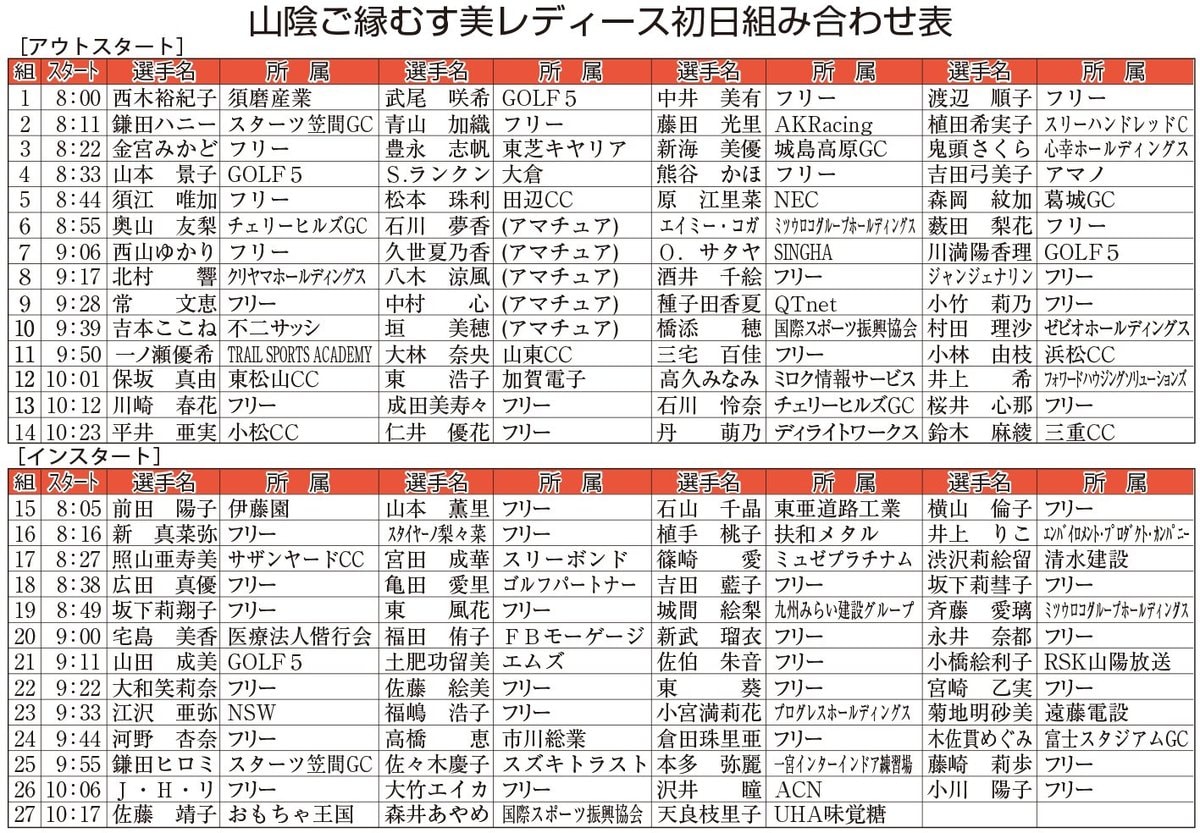 24日に大山平原ゴルフクラブ(鳥取県伯耆町丸山)で開幕するステップアップツアー「山陰ご縁むす美レディース」(日本女子プロゴルフ協会主催、山陰中央新報社共催)の初日の組み合わせが23日、決まった。