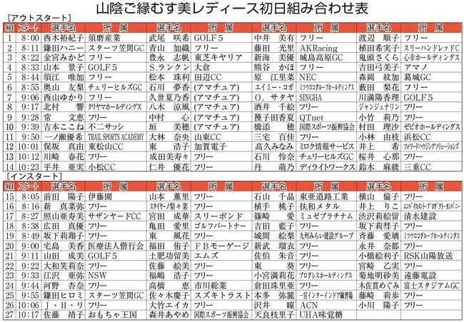 地元関係は、米子市在住の金宮みかど(フリー)がアウトスタート3組(午前8時22分開始)、同市出身のアマチュア・垣美穂(岡山・作陽高1年)はアウトスタート10組(午前9時39分開始)でプレーする。