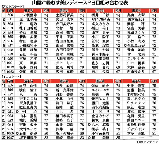 山陰ご縁むす美レディース 2日目の組み合わせ スポーツ 山陰 2022/8/24 22:31 保存 2日目の組み合わせ 大山平原ゴルフクラブ(鳥取県伯耆町丸山)で開催している、女子プロゴルフのステップアップツアー第9戦「山陰ご縁むす美レディース」(日本女子プロゴルフ協会主催、山陰中央新報社共催)2日目の組み合わせが決まった。 無料会員に登録すると 付き記事が毎月5本読める 無料会員に登録する ログインする サービス内容を確認する 保存 記事を保存する この機能は有料会員限定です。保存した記事やフォローした特集をマイページでご覧いただけます。 有料会員になる ログイン 関連記事 松江市立皆美が丘女子高、岐路に 県立高との生徒確保競争が激化 求められる「他校にない特色」 2026/4/15 18:00 【記者解説動画】春の高校野球島根大会 注目のチーム、選手を紹介 17日開幕 2026/4/15 18:00 日帰り温泉「大森の湯」リニューアル サウナや休憩エリア充実、ゆっくり滞在できる施設に 2026/4/15 16:40 三瓶山で山開き 西の原で神事 登山シーズン始まる 2026/4/15 14:30 【島根県・鳥取県のクマ目撃マップ】目撃情報をマップで可視化(4月15日更新) 2026/4/15 12:05 特集・連載 山陰中央新報デジタル 春得キャンペーン 開催中! 2026/2/25 16:15 領有権確立、進展ないまま 竹島の日、22日で20回目 2025/2/22 04:00 奥出雲で出張レストラン 恐竜カレーセット好評 松江の専門学生運営 2024/10/26 04:00 アルコール依存症(3)「依存症に一人で打ち勝つのは相当難しい」 山陰断酒学校の運営担う70代女性の体験談〈顔なき…声〉 2024/10/14 14:37 山陰リーダーズ・アイ2026 vol.1 松原タニシと吉田悠軌の『怪談×島根』~怪談とシジミで整う夜~ 今こそ、石見へ。 山陰道三隅・益田道路が開通しました! 地元で育つミライのチカラ 島根県立矢上高校