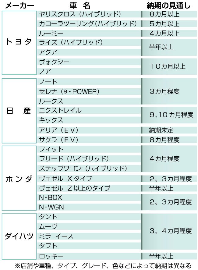 コンパクトカーのアクアと、SUVのライズはいずれも半年以上で、ファミリーに人気の高いミニバンのヴォクシー、ノアは10カ月以上。コンパクトカーのルーミーは4カ月以上だ。店舗ではこれまで、顧客に対して車検の半年前に買い替えを提案し、車検までに新車を納車することが一般的だった。納期が不透明な今では提案時期を早めており、担当者は「1年以上前から余裕を持って検討しておくと安心」と話した。