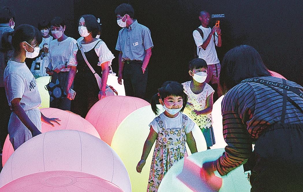 デジタルアートを手がけるチームラボ(東京都)が展示する作品は、スキャナーで取り込み会場内で投影した動物の絵が動き回ったり、滑り台を子どもたちが滑り降りると台上に投影されたフルーツがはじけたりする趣向。たたくと色が変わり音が出るボールも子どもたちを楽しませた。