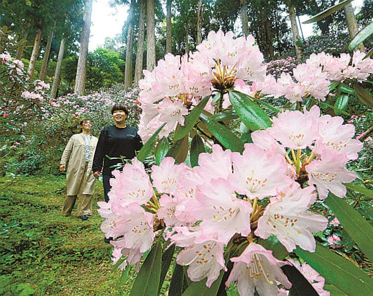 【隠岐の島】隠岐島後の春を彩るオキシャクナゲが島根県隠岐の島町郡の村上家隠岐しゃくなげ園で満開を迎えた。地元で「山の花の女王」と呼ばれ、淡いピンク色をまとった風格のある花姿が訪れた人を楽しませている。