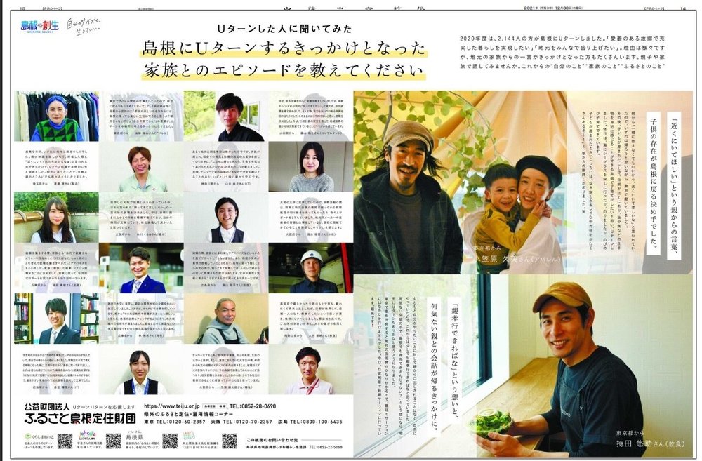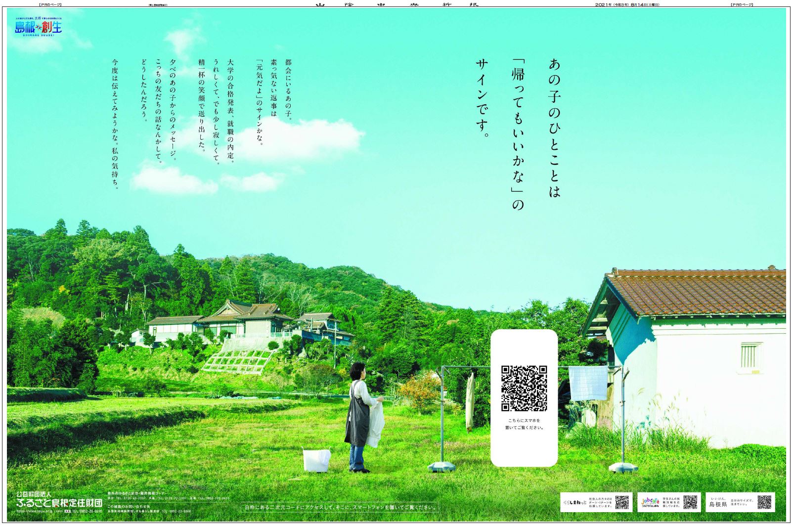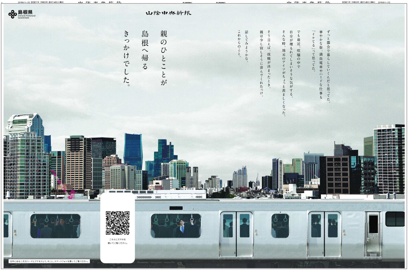 広告は県地域振興部と政策企画局が企画。ラッピング広告の表面に都会で忙しく暮らす若者、裏面に島根で子を思う母親の様子を載せた。紙面上のQRコードにスマートフォンをかざすと約1分半の短編動画が流れ、母子が登場人物となって都会と島根の生活が対比される。紙面とデジタルの融合を図った。