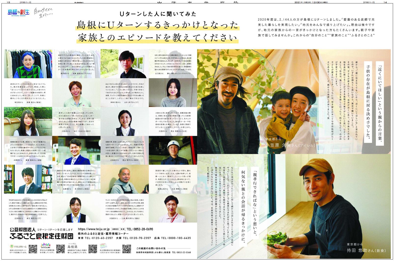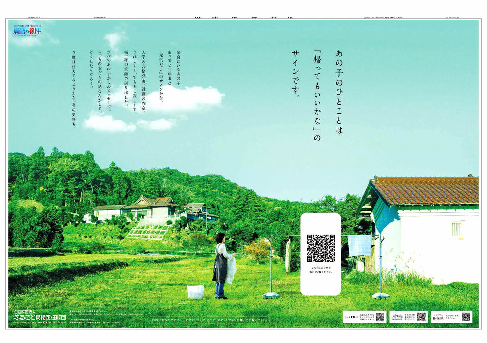 第42回新聞広告賞広告賞に選ばれた島根県のUターン促進企画「親のひとことが島根へ帰るきっかけでした」は、紙面上のメッセージとスマートフォンの映像を絡め、親と子の絆をあらためて考えさせる作品。交流サイト(SNS)で「離れている長男を想(おも)い泣きそうになった」などの反響があり、親元と都会地をつなぐきっかけをつくった。