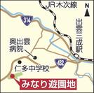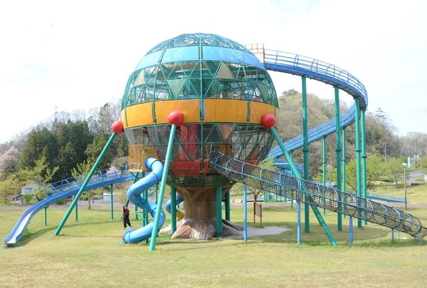 島根県奥出雲町三成の国道432号沿いにある「みなり遊園地」。近くにある国の名勝・天然記念物「鬼の舌震(したぶるい)」にある巨岩を模して造られた複合遊具「オロチランド」をはじめ、地域色豊かな遊具が整備されている。