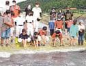 アユの伝統漁法が体験できる観光「簗(やな)漁」が11日、島根県美郷町都賀西の江の川で開かれた。観光簗漁は今回、初めての取り組み。子どもたちがアユを手で捕まえ、伝統漁法を楽しんだ。観光簗漁を写真で紹介する。 (川本支局長・佐伯学)
