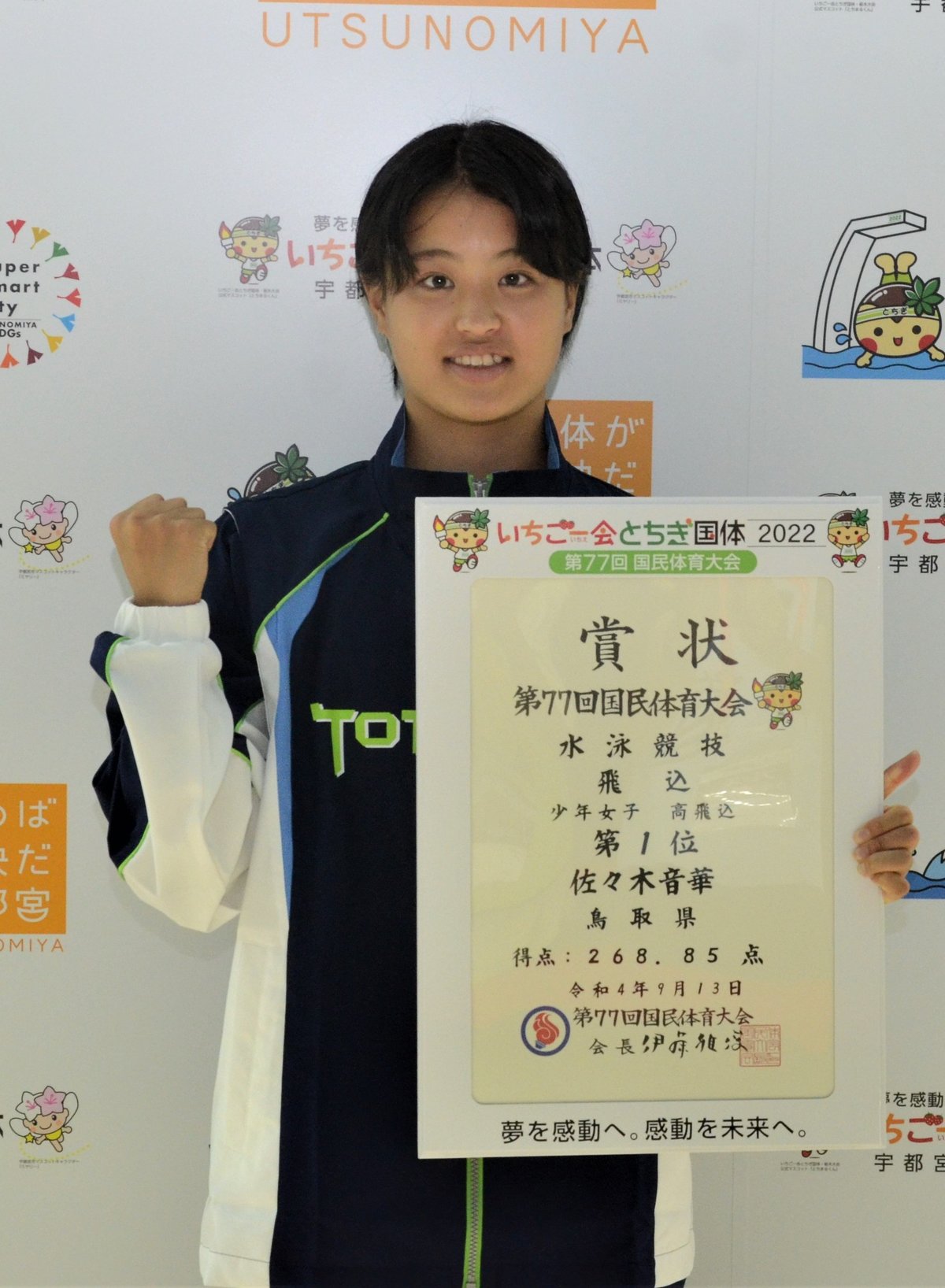 宇都宮市で13日に行われた第77回国民体育大会「いちご一会とちぎ国体」会期前競技の飛び込み少年女子高飛び込みで、鳥取の佐々木音華(おとは)(米子東高)が優勝した。高飛び込みと板飛び込みの2冠に輝いた8月の全国高校総合体育大会(インターハイ、四国総体)に続き、大舞台で頂点に立った。