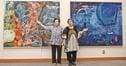 一枝さんは自身の内面を描いた抽象画「わたしはわたし」シリーズで、赤、青の丸や四角の模様を描き、画面に粘土や目の粗い布を張って立体感を出した新作が目を引く。