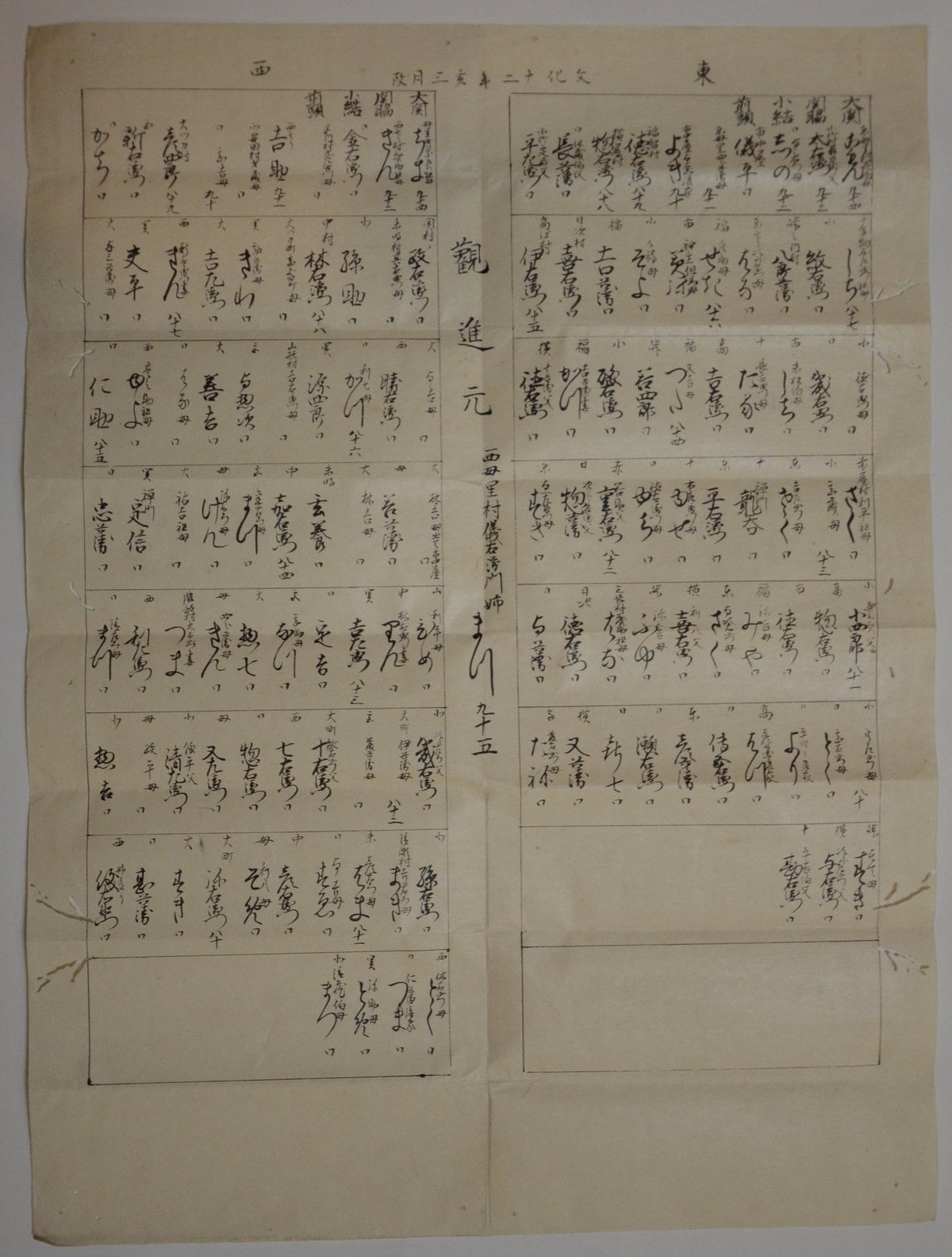 安来市伯太町東母里の旧家・柴田家の古文書から江戸後期の1815年の「長寿番付」が見つかった。母里藩の18村(現在の安来市伯太町などの地域)で、数え年80歳以上の男女138人の名前が記され、最高齢は95歳の女性だと分かる。当時の暮らしぶりや敬老思想の浸透を探る上で貴重な資料になりそうだ。