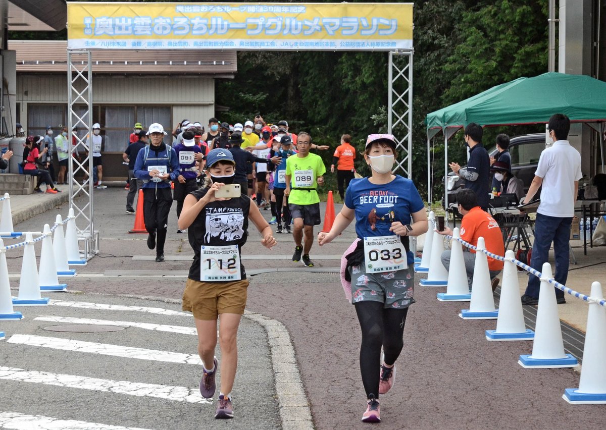 ループ近くの道の駅・奥出雲おろちループ(島根県奥出雲町八川)を発着点、絲原記念館(奥出雲町大谷)を折り返し点とする36・6キロコースで開催。ソロに270人、1チーム2~5人で走るリレーに145人が参加した。