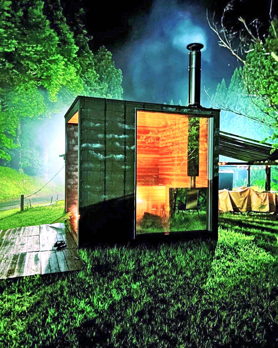 レジャー施設運営などの(株)ラウ(松江市西川津町、秋森誠社長)と、工務店の(株)いちい(同市玉湯町湯町、渡部智司社長)が組み、屋外に設置できる箱形のサウナ「CUBIC SAUNA神有」を開発した。側壁に大きなガラス面を張ったおしゃれな仕様で、島根県産の木材やサウナ石を用いた。近年のサウナブームの波に乗り、全国販売を目指す。