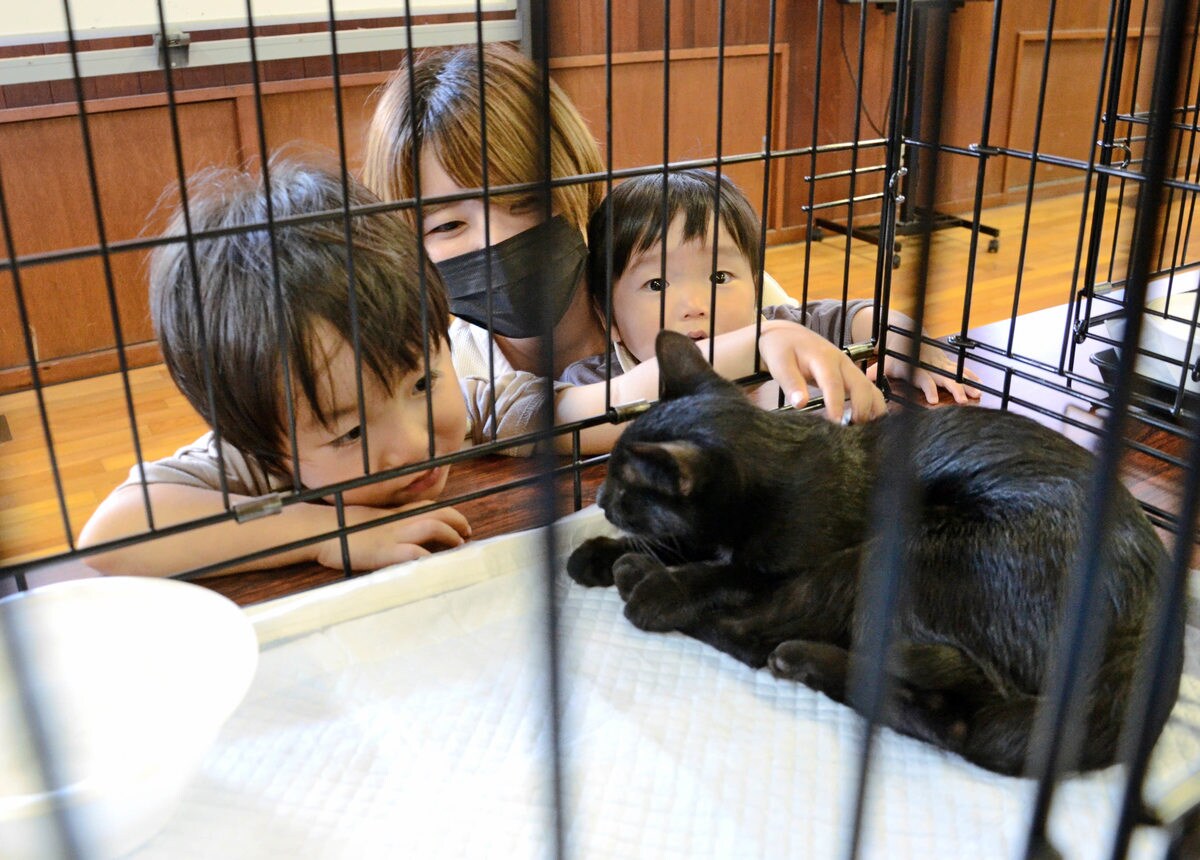 会場の剣道場には、飼い主に捨てられた犬や保護された後に健康状態をチェックされた野良猫など、生後1歳以下を中心に犬5匹、猫16匹がそれぞれのゲージで未来の家族を待った。
