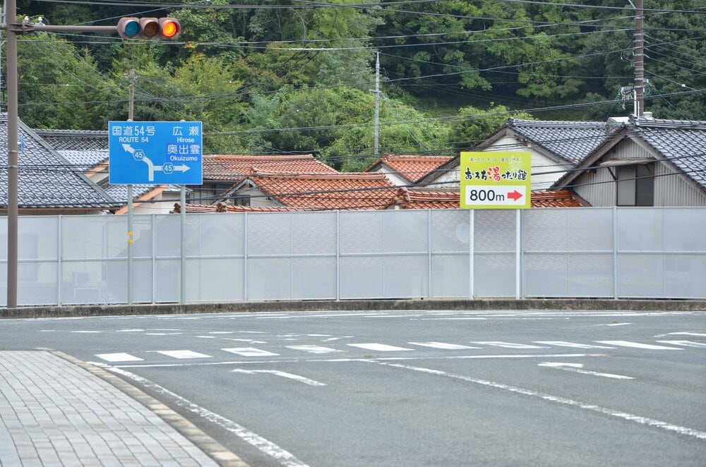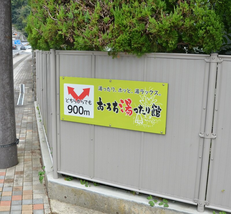 稲村課長は「(現場に)何かしらの看板があったという記憶はあるが、さすがに当館の関連のものではないと思う」と苦笑い。近くの2カ所に館が設置した案内看板があるが、黄緑色を基調に「おろち湯ったり館 800m」としっかり道筋や目的地を示している。設置場所が近かったとはいえ、情報量が少なすぎる「左右看板」と比べるのは失礼だったかもしれない。