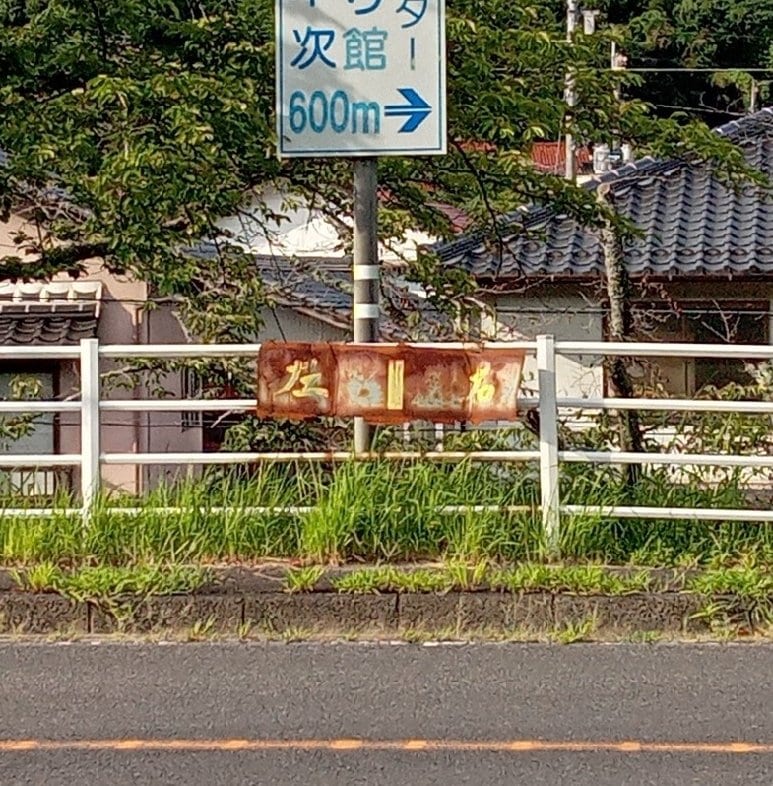 看板の正面に道が延びており、県道と合流する丁字路になっている。看板の向きから考えて、正面の道路から来た車に向けたものと考えられるが、それにしては小さすぎる。しかも看板のすぐ上には、600メートル先に「おろち湯ったり館」があることを示す正規の看板がある。ますます看板の存在意義が分からない。