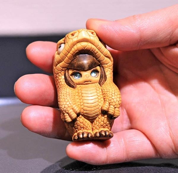 高さ約6センチで、手のひらにすっぽりと収まる根付に美少女の顔。東京都文京区のギャラリー花影抄で4月に開いた個展に出した新作「オロチノキグルミヒメ01」は、3頭身の女の子が出雲神話に登場する八岐大蛇(やまたのおろち)の着ぐるみをまとう姿を表現した。