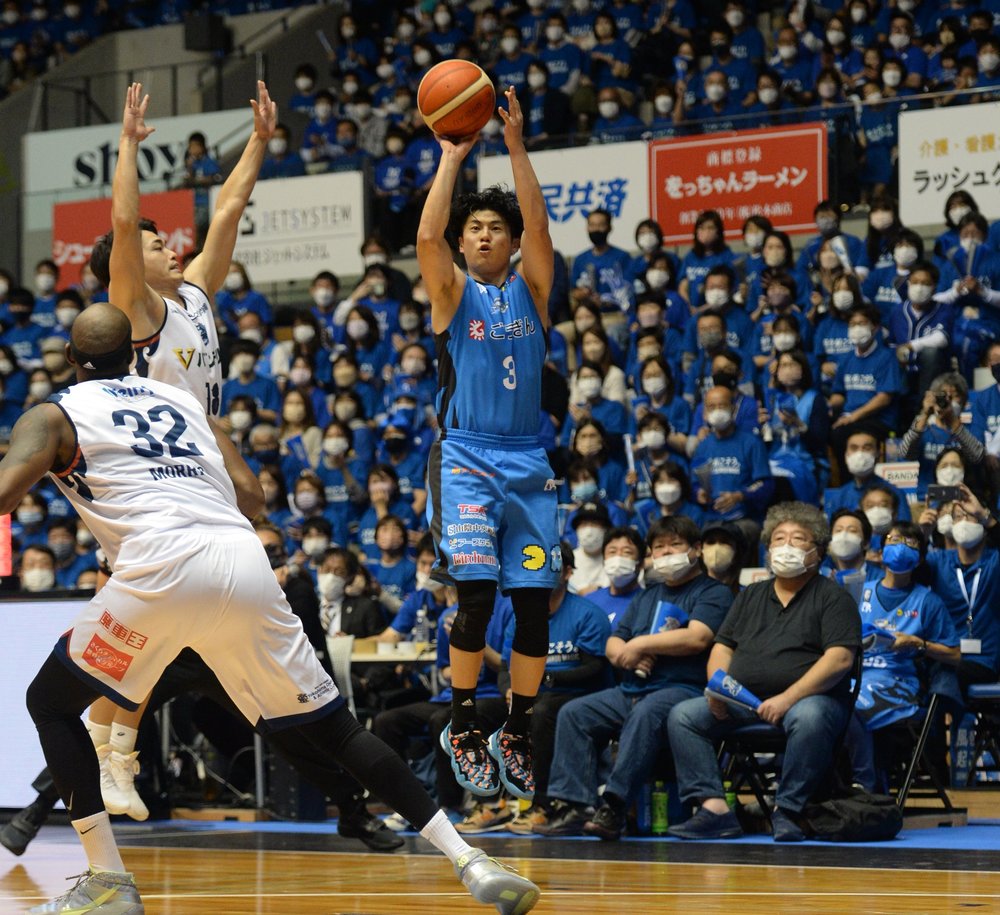 バスケットボール男子Bリーグ1部(B1)の島根スサノオマジックが8日、ホームの松江市総合体育館(松江市学園南1丁目)に横浜ビー・コルセアーズ(中地区)を迎えて第3戦を行い、68ー64で勝利した。島根は同点で迎えた第2クオーターにトラビスのダンクなどでリードを奪い、39ー34で折り返した。後半はリードを許す場面もあったが、第4クオーター終盤に安藤の3点シュートなどが決まり、競り勝った。通算2勝1敗。