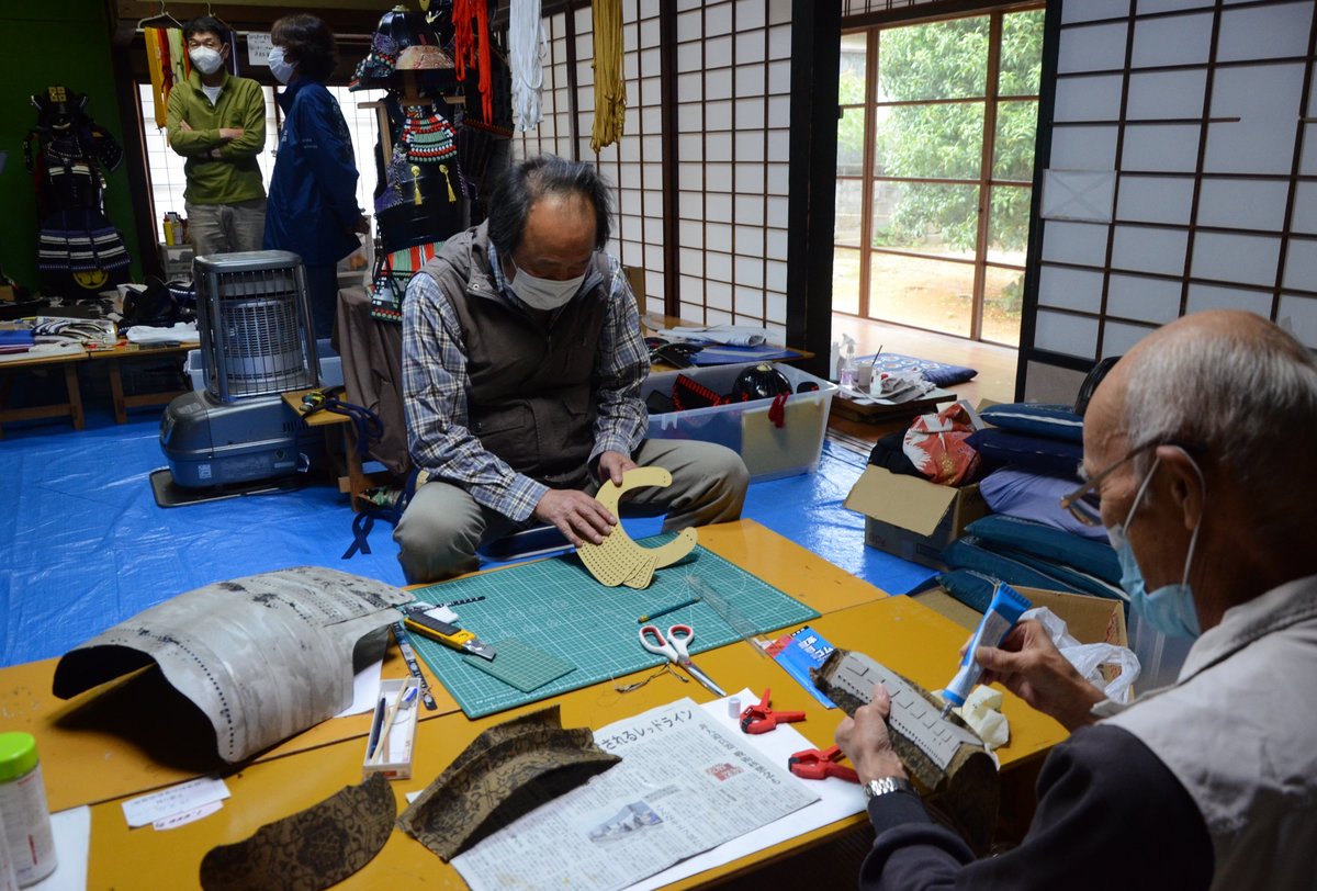 野々村さんは07年に制作に参加して魅力に引かれ、指導役となった。趣味のウインドサーフィンでFRP(繊維強化プラスチック)の加工経験を生かして改良を進め、現在の完成度に至った。これまでに150領ほど手がけた中でお気に入りはメタリックブルーの甲冑だという。「本物は黒や赤に色が限られるが、紙製の甲冑は好きなように作れるのが魅力だ」と語る。