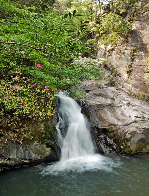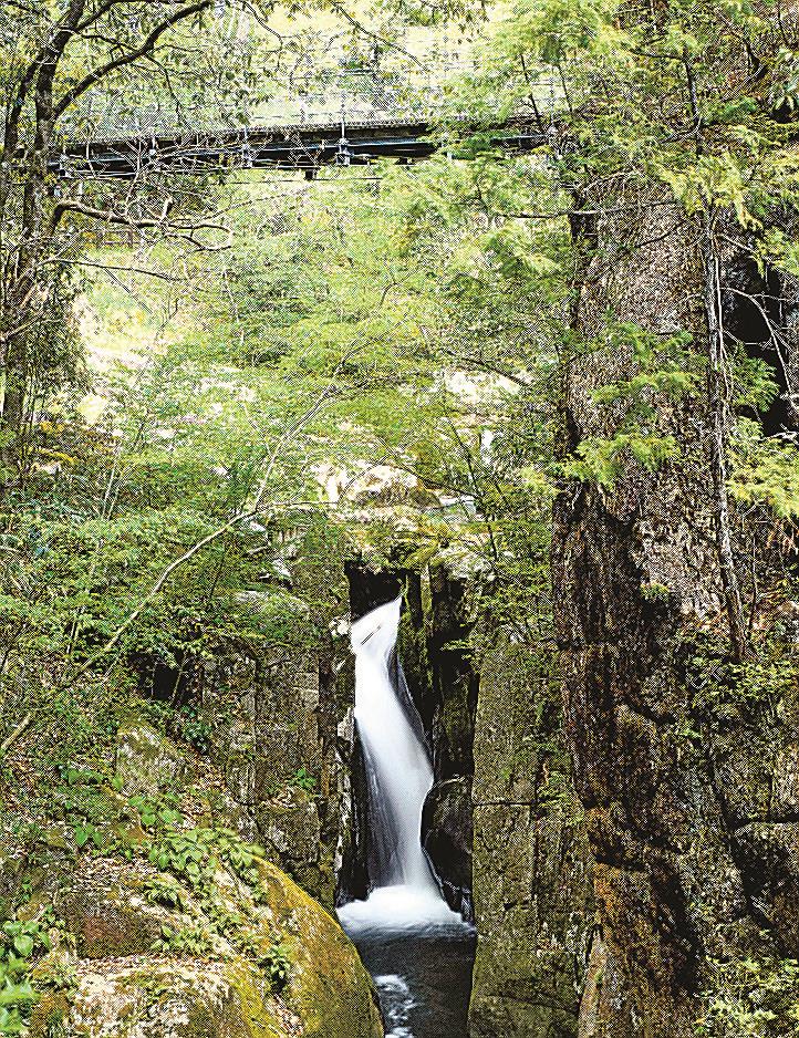 島根県美郷町の比之宮地区にある景勝地。断崖の間の大小三つの滝が、淵をつくる。つり橋や遊歩道を歩きながら、自然や絶景を満喫できる。