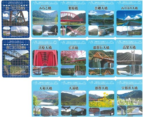 縦9・2センチ、横6・7センチのカードに取り入れたのは道路橋12本、旧JR三江線の鉄道橋2本。