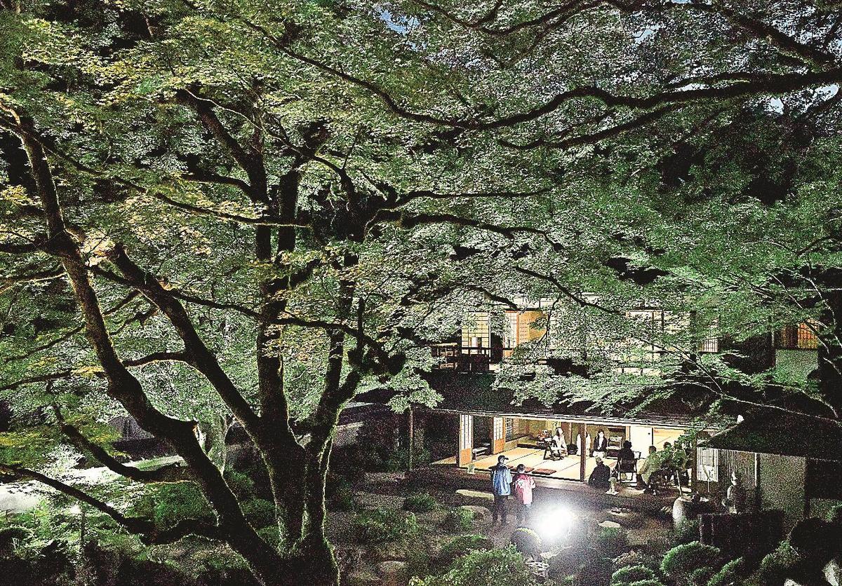光に照らされた青葉の美しさを楽しんでもらう「新緑ライトアップ」が行われている島根県津和野町邑輝の国名勝・旧堀氏庭園で3日、開館時間が午後8時まで延長された。来場者が闇に浮かぶカエデを園内の間近な場所で眺め、夏へと向かう季節の変化を感じている。4日も。