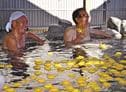 ゆず湯は血行促進や疲労回復の効果があるとされ、この日は男女の露天風呂にそれぞれ午前と午後で150個ずつ、計600個が浮かべられた。