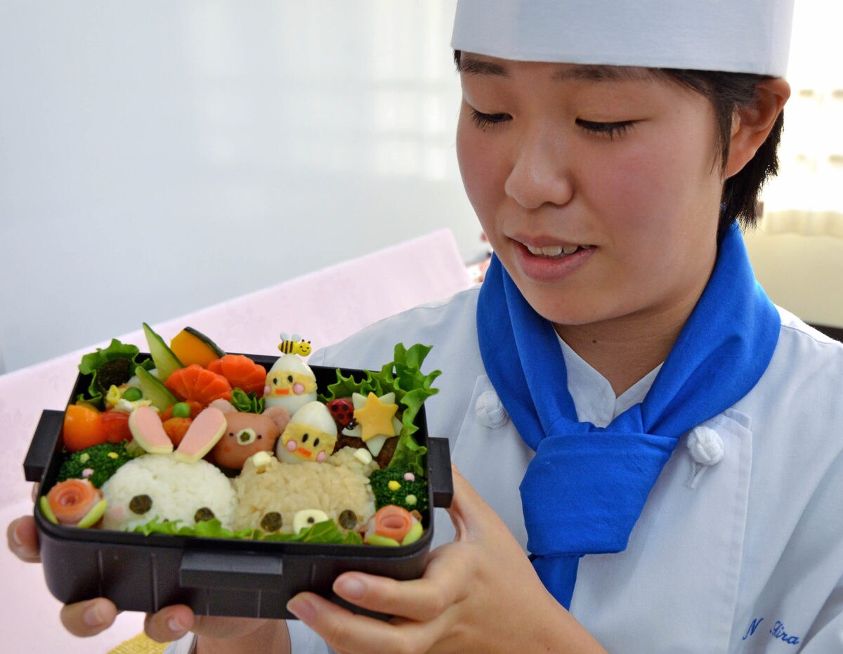 コンテストは日本調理師会が主催し12回目。家庭学科調理コースで学ぶ吉良さんの弁当は、クマのおにぎりを麺つゆで着色し、うずらの卵でひよこをあしらうなどして、動物たちをかわいらしく表現。農家の祖父母が作ったカボチャも使用し「色合いを工夫し、ふたを開けてうれしくなる弁当に仕上げた」と振り返る。