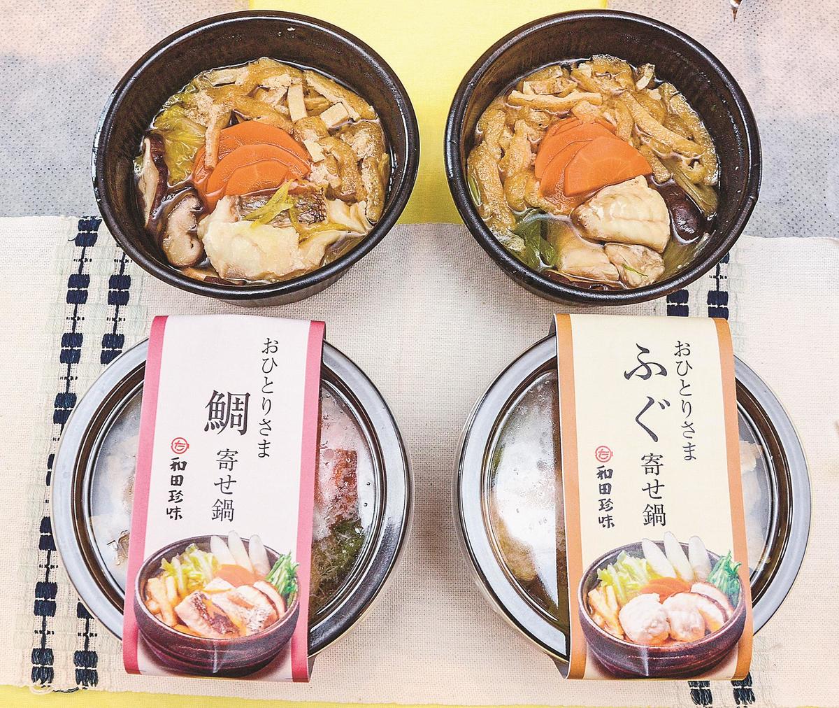 水産加工の和田珍味(大田市五十猛町)が1人用の冷凍鍋「ふぐ寄せ鍋」「鯛(たい)寄せ鍋」を発売した。