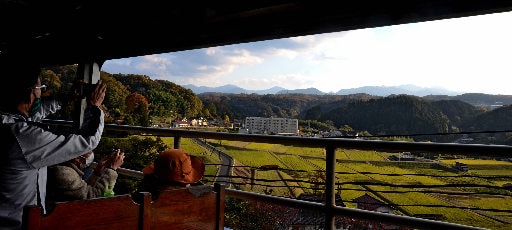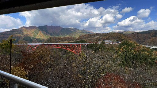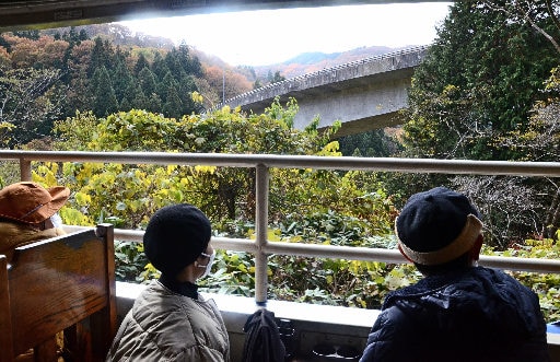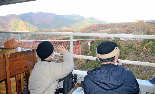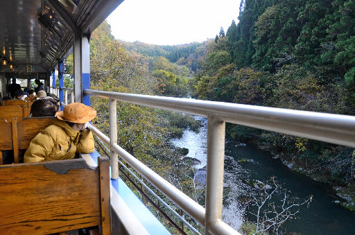 好天に恵まれ、青い空に赤や黄色に紅葉した木々や三井野大橋が映え、思わず息をのんだ。ほかの乗客も、窓のない開放的なトロッコ列車から望む絶景に「すごい」という声が次々と上がった。
