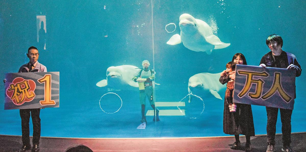 3人は3頭のシロイルカが集まるパフォーマンスプールに移動。3頭がそろって数字の「0」に見立てたバブルリングを出すのと同時に、館が用意した文字入りパネルを掲げ「祝1000万人」のメッセージを表現した。ほかの来館者も貴重な瞬間を収めようとシャッターを切っていた。