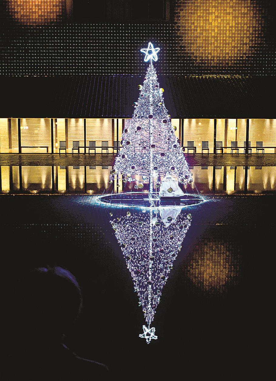 益田の冬を彩る恒例のイルミネーション「グラナリエ」が、益田市有明町の島根県芸術文化センター・グラントワで始まった。発光ダイオード(LED)約1万球を使った高さ5メートルの電飾ツリーが中庭広場中央の水盤スペースに設置され、水面や回廊のガラスに光が映り込む幻想的な光景が楽しめる。12月25日まで。
