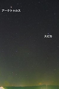 おとめ座(ざ)のスピカという明るい星は、今の季節の午後9時ごろなら、南あたりの中ほどの空に見えています。その東側の高いところには、さらに明るい、うしかい座のアークトゥルスという星があって、スピカとともに目立っています。