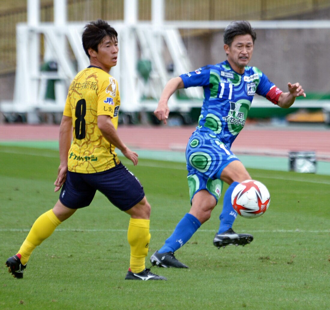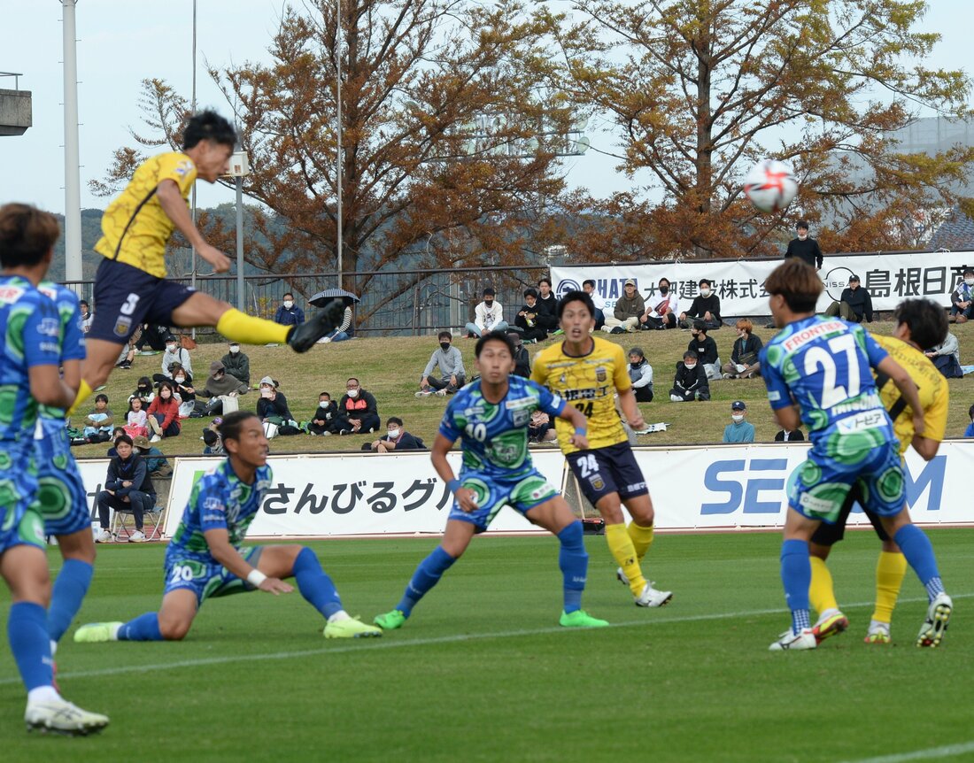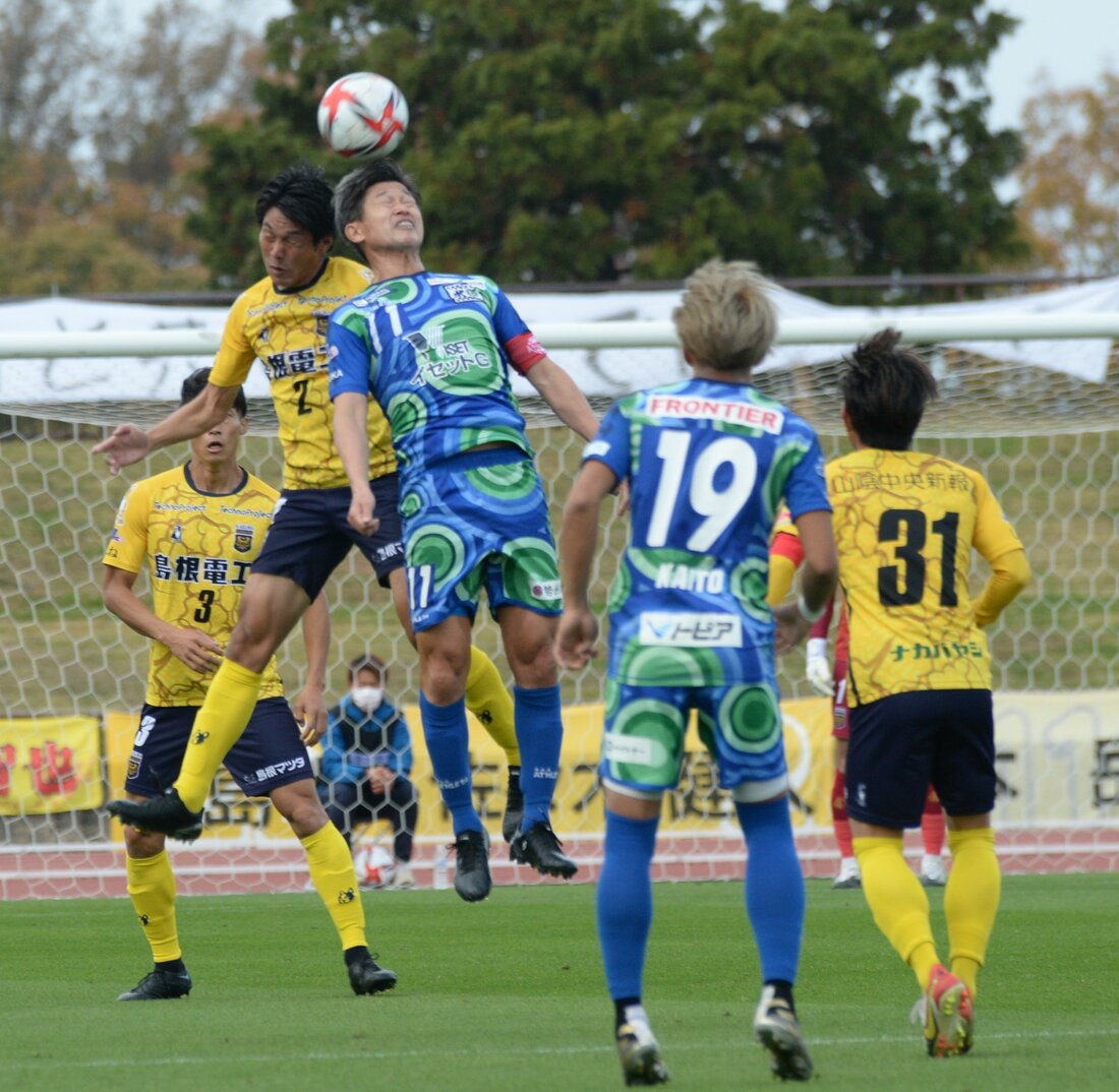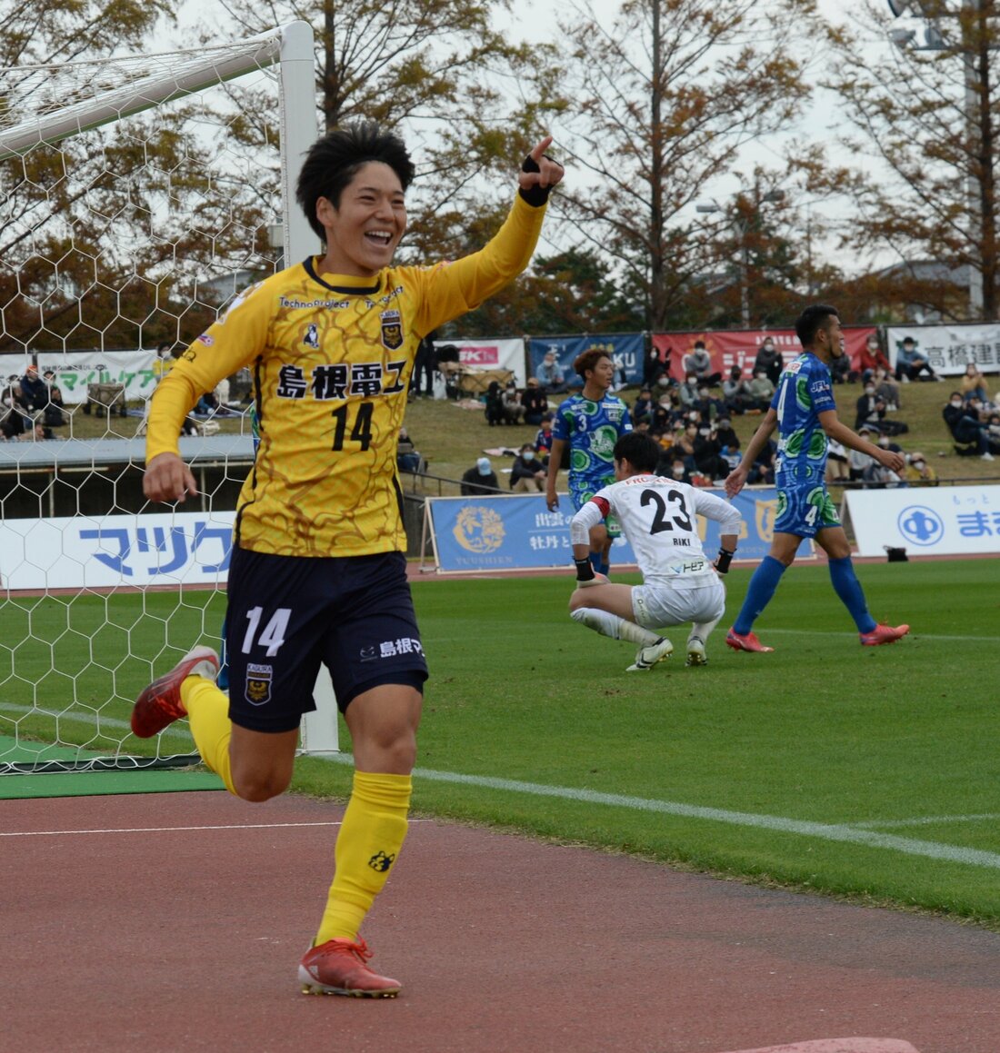 日本フットボールリーグ(JFL)は20日、今季最終戦となる第30節3試合があり、FC神楽しまねはホームの松江市営陸上競技場で鈴鹿ポイントゲッターズを3ー0で下した。前半に下村がゴール前のパスを頭で押し込み先制、谷尾が2点目を追加した。後半にはディフェンス陣の奮闘で無失点に抑え、山本が1点を獲得し勝利を決めた。対戦相手の鈴鹿ポイントゲッターズは元日本代表のFW三浦知良がスタメンで出場し、サッカーファンを沸かせた。試合の様子を写真で紹介する。