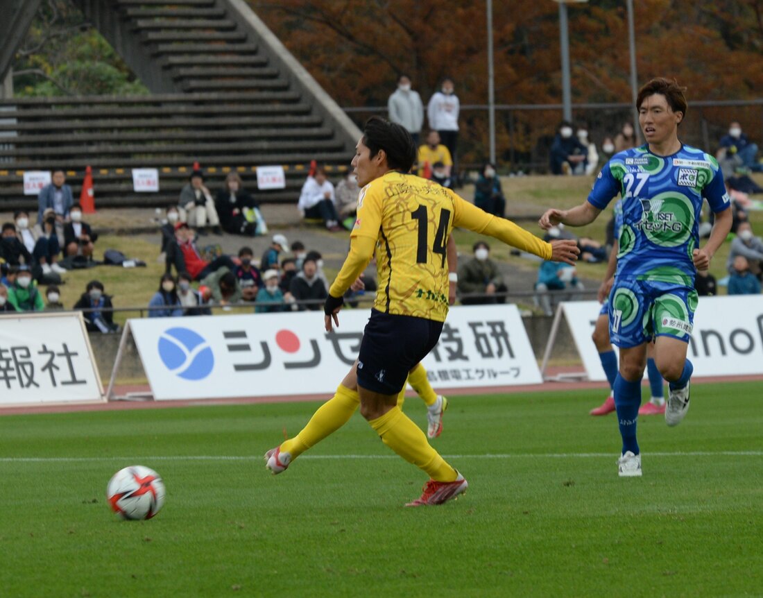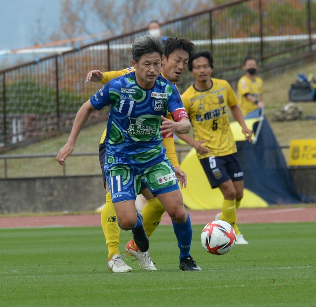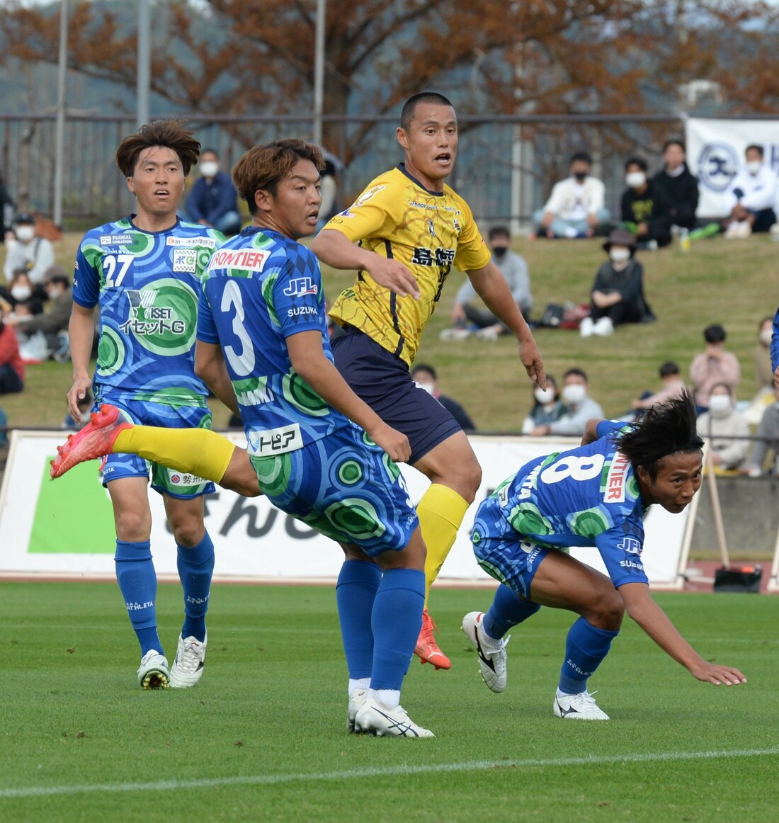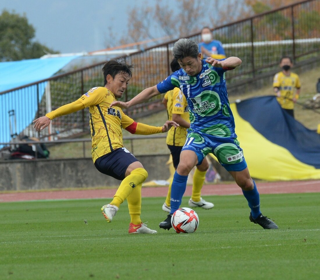 日本フットボールリーグ(JFL)は20日、今季最終戦となる第30節3試合があり、FC神楽しまねはホームの松江市営陸上競技場で鈴鹿ポイントゲッターズを3ー0で下した。前半に下村がゴール前のパスを頭で押し込み先制、谷尾が2点目を追加した。後半にはディフェンス陣の奮闘で無失点に抑え、山本が1点を獲得し勝利を決めた。対戦相手の鈴鹿ポイントゲッターズは元日本代表のFW三浦知良がスタメンで出場し、サッカーファンを沸かせた。試合の様子を写真で紹介する。