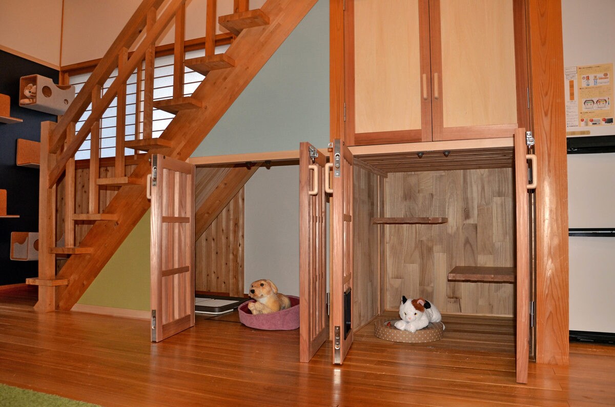 住まいりんぐプラザ(木造2階建て、延べ床面積495平方メートル)は、階段下のスペースをケージとして活用したほか、キッチンに侵入しないための柵や猫用の遊具「キャットウォーク」を設置。カーテンや網戸、中庭の人工芝なども爪が引っかかったり、破れたりしにくい仕様にした。コンセプトは「ペットと暮らす木の家」。約150万円をかけた。