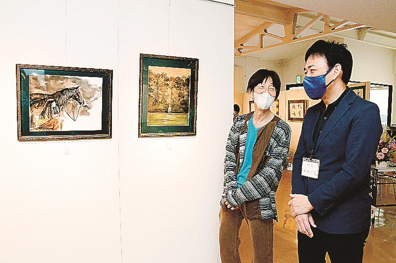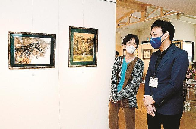 水墨画の要素を取り入れた水彩画作品づくりに取り組むすやまさんと、書歴40年の木村さんがそれぞれの作品の良さを知ってもらおうと企画した。