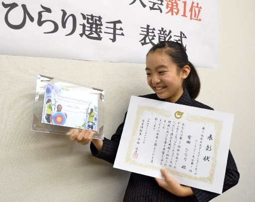 10月に静岡県掛川市であった全国大会「第5回ゴールデンエイジカップアーチェリー大会」の小学生女子の部で、日吉津小学校6年の有田ひらりさん(12)が優勝し、鳥取県日吉津村が26日、好成績をたたえて表彰状を贈った。有田さんは「地域に勇気と喜びを届けられるように、さらに頑張りたい」と決意を新たにした。