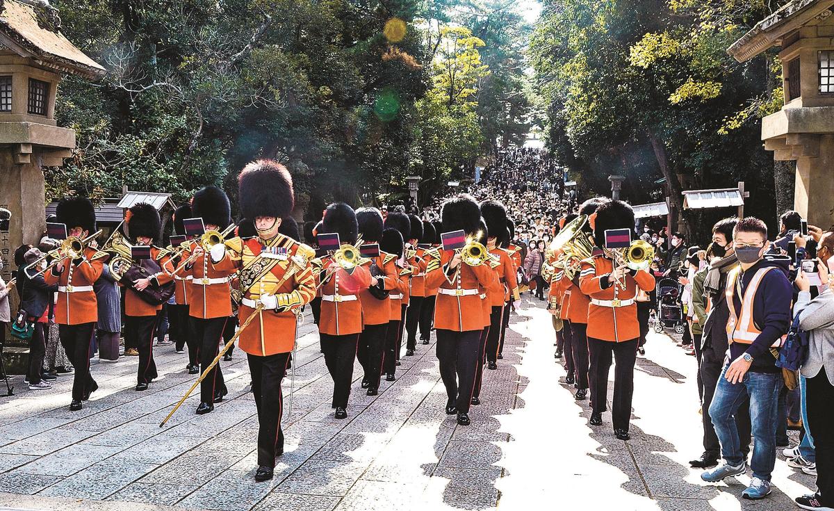 故エリザベス女王の在位70周年を記念した、英国の近衛(このえ)軍楽隊による特別パレードが27日、出雲、松江両市内であり、出雲大社(出雲市大社町杵築東)では格調高く参道を練り歩いた。