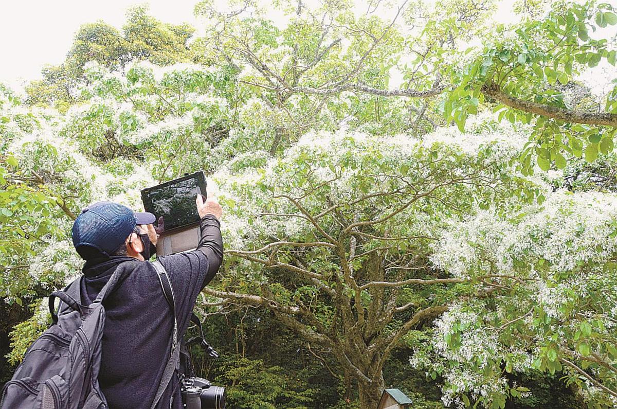 【松江】松江市殿町の松江城山公園で、ナンジャモンジャの花が見頃を迎えている。観光や散歩で訪れた人たちが足を止め、無数に広がった2センチほどの白い花が風に揺れる様子を、熱心にカメラに収めている。
