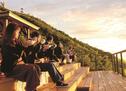 午前6時30分ごろになると、空は明るくなってきたが、雲は消えない。残念ながら日の出は拝めなかったが、雲の切れ間から見える日の光が幻想的な雰囲気を醸し出していた。澄んだ空気に包まれ、美しい山並みや眼下に広がる田園風景を眺めながら、温かい朝食をいただく。
