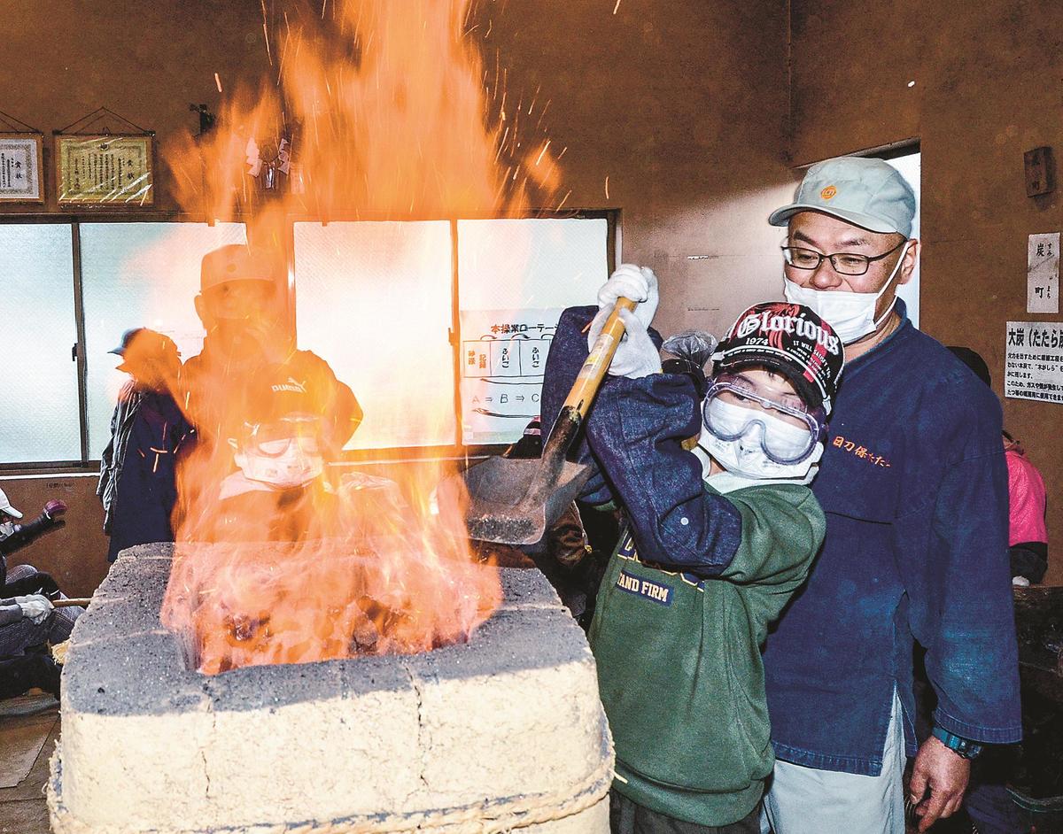 【奥出雲】島根県奥出雲町の小学校5、6年生115人が1、2の両日、鳥上小学校(奥出雲町大呂)の古代たたら体験学習工房でたたら操業を体験し、郷土の伝統技術の魅力に触れた。