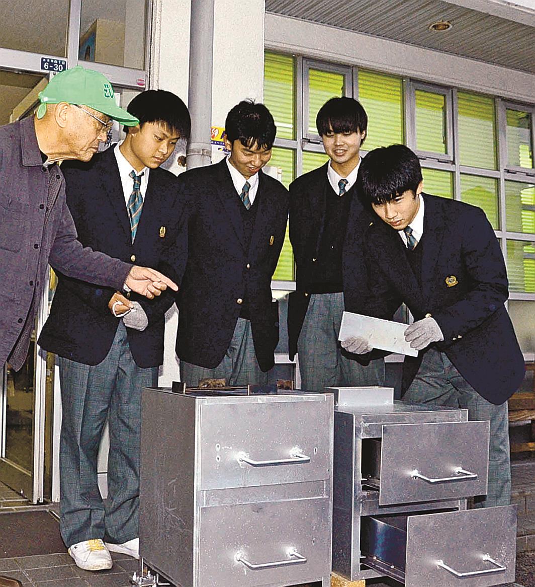 【松江】おいしい焼き芋をみんなで食べて交流を深めてもらおうと、松江工業高校(松江市古志原4丁目)電子機械科の生徒5人が13日、授業で学んだ溶接技術を駆使して作った焼き芋製造機を、近くの古志原公民館に贈った。