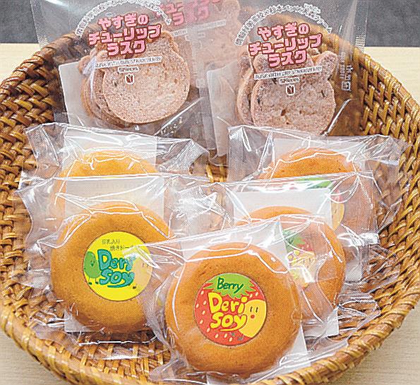 開発した3品は、チューリップの花の形で乾燥イチゴを練り込んだ「やすぎのチューリップラスク」と、豆乳入り焼きドーナツ「デリソイ」、さらにイチゴのピューレを練り込んだ「ベリーデリソイ」。
