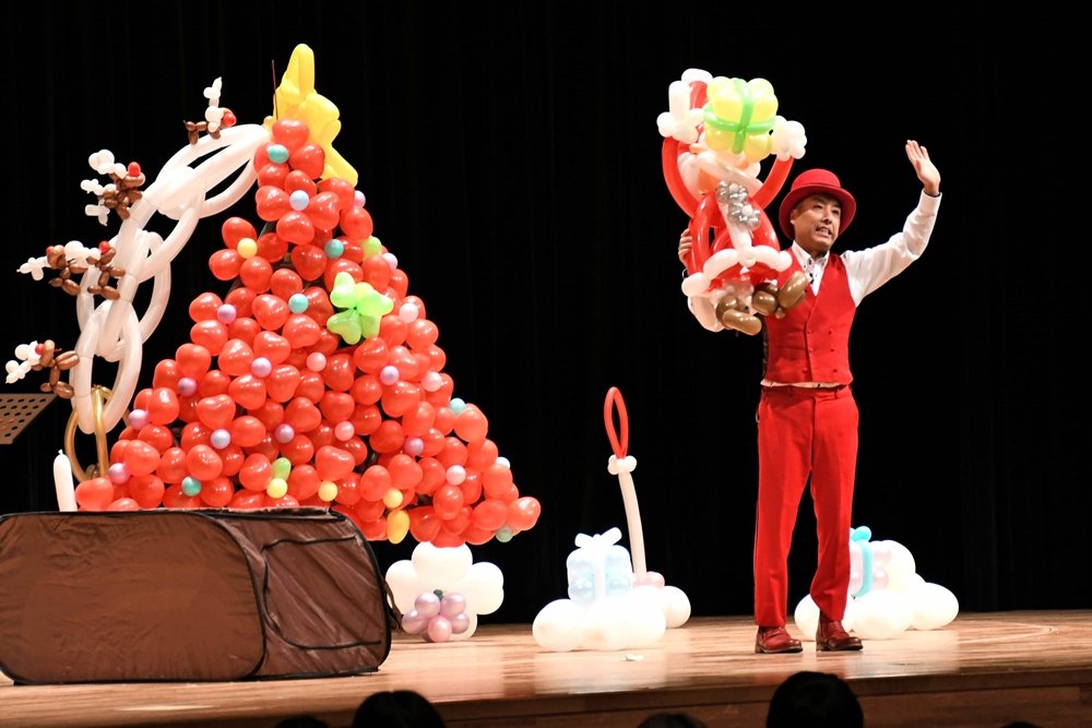 ステージでは山陰を中心に活動する3人のアーティストが登場した。松江市在住のよしとさんが、歌って踊れる参加型の紙芝居を披露し、米子市出身のさと原人さんはバルーンアートでクリスマスツリーの上に飾る星と、サンタクロースをその場で作った。